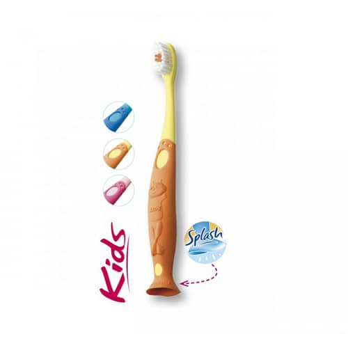 ELGYDIUM SPLASH Ages 2 to 6 years old is a toothbrush with a small head that has been specially designed for kids mouths. It has a fun handle and a suction cup to encourage kids in brushing their teeth. Its soft and finely rounded bristles have been developed to be gentle on the teeth and gums. The bristles have a concave trim to fit the rounded surface of milk teeth and the coloured bristles helps the kid to know how much toothpaste to use.